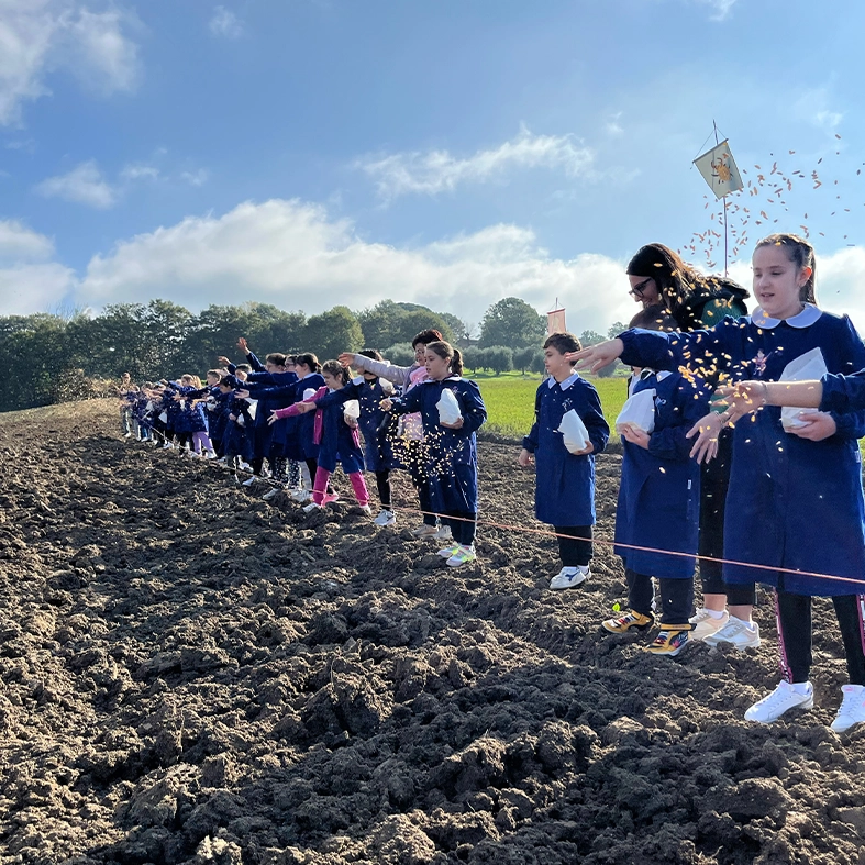 Protagonisti sono stati ancora una volta le bambine e i bambini della scuola primaria “De Filippo – Don Diana”, coinvolti in un’esperienza che ha unito apprendimento, partecipazione e relazione con il territorio. Nel campo, lungo i solchi, la semina si è fatta gesto condiviso: semplice, concreto, simbolico.